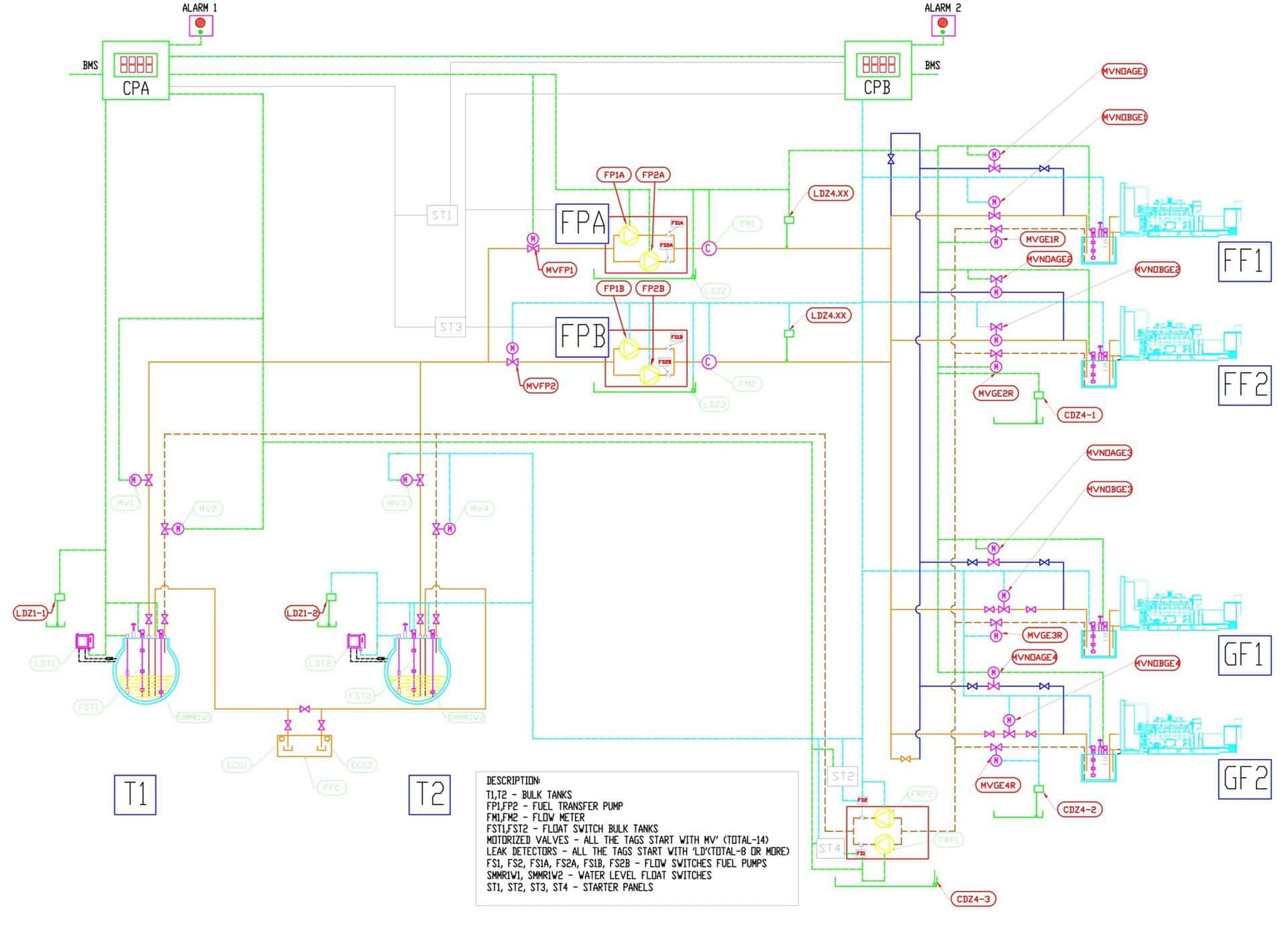 Es wurden 4 miteinander verbundene Dieselversorgungsleitungen von 2 Haupttanks zu 4 Tages Tanks von Aggregaten installiert, die sich auf 2 verschiedenen Ebenen befinden. Alle werden von einer SPS-gestützten CAG+-Schalttafel gesteuert, um einen doppelten Master-Betrieb von jeder der 2 Schalttafeln aus zu ermöglichen.